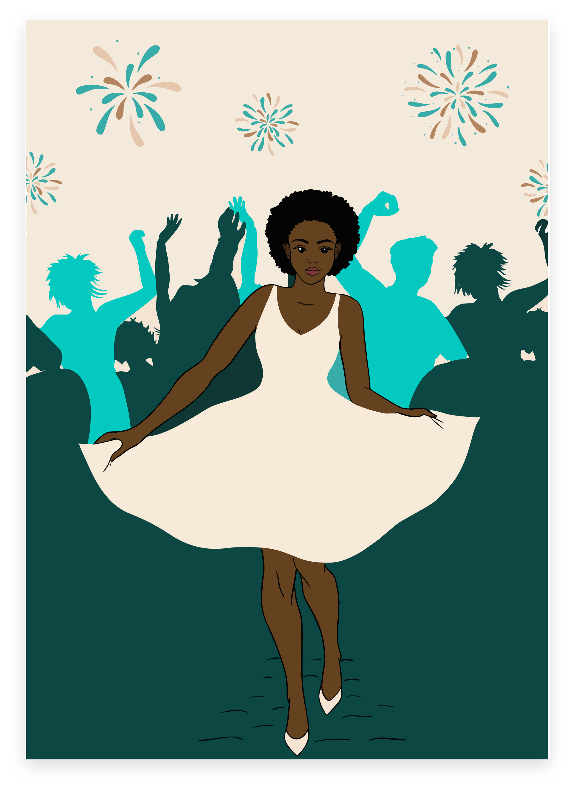 Une jeune femme noire danse au centre, représentant la joie de la célébration, tandis que des ombres dansantes en arrière-plan soulignent le caractère festif et collectif.